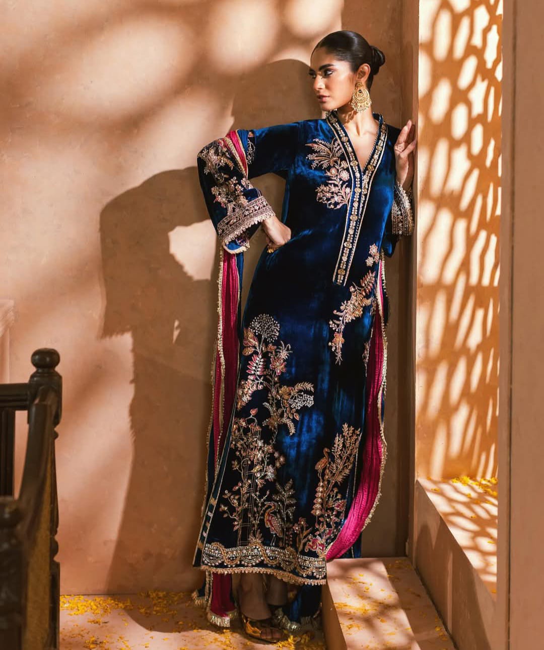Fabric: Velvet Shirt, heavy zardosi work, paired with crushed silk dupatta & plain pants