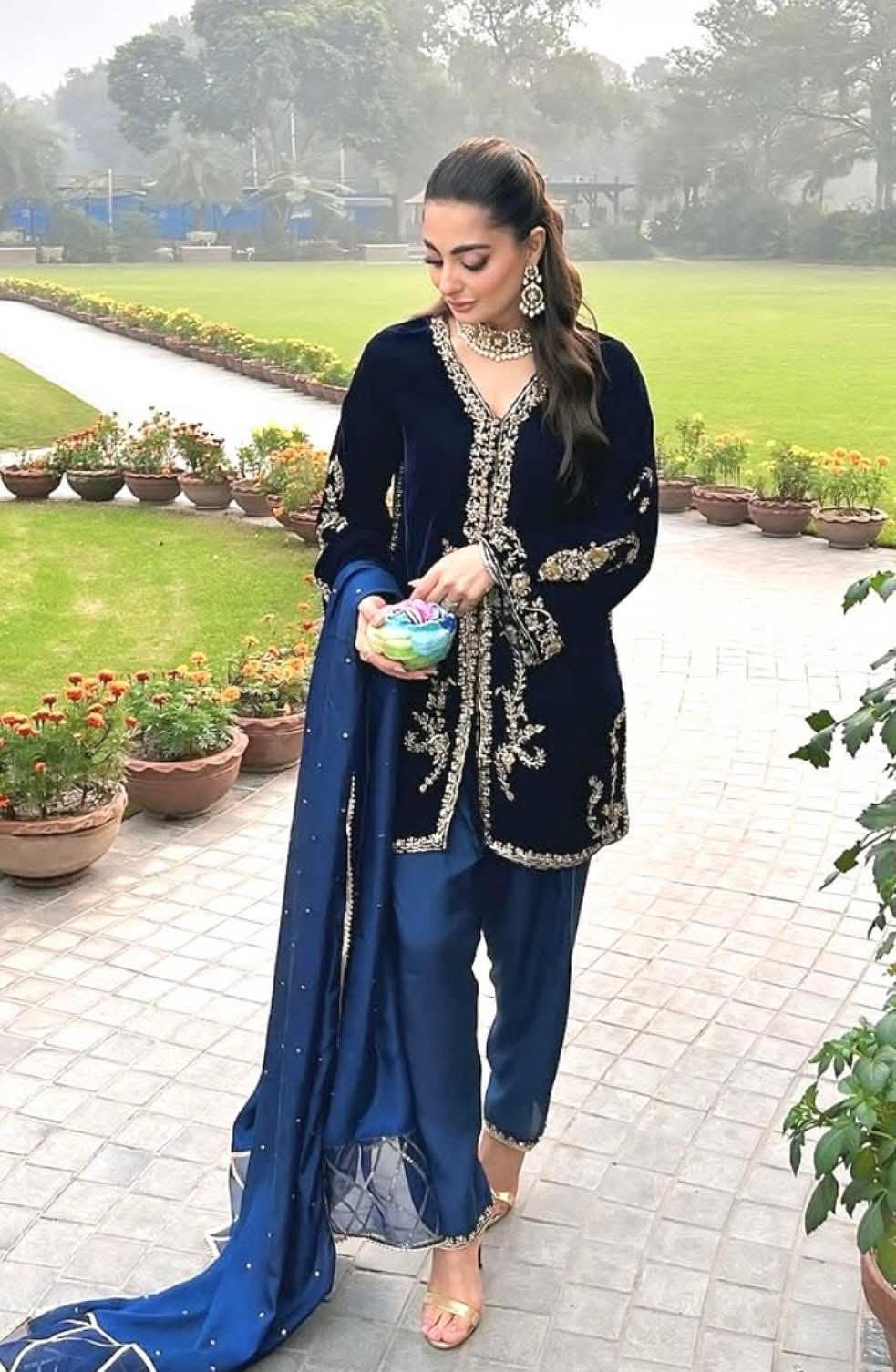 Fabric: Handworked Velvet front open jacket with handwork korean raw silk pants and medium silk dupatta embellished pallu