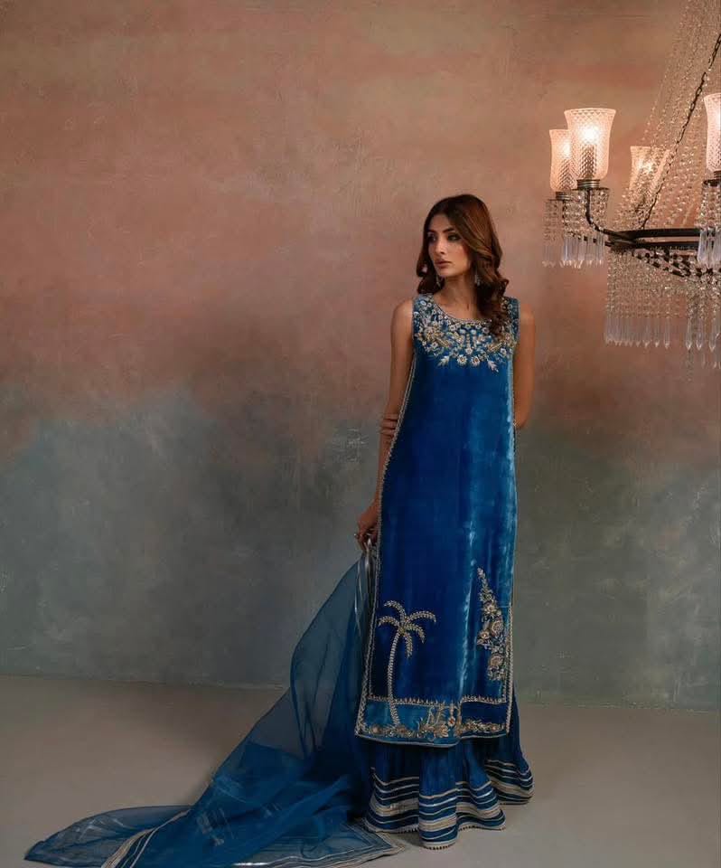 Fabric: Zardozi worked shirt with gota embelished korean raw silk sharara paired with organza dupatta
