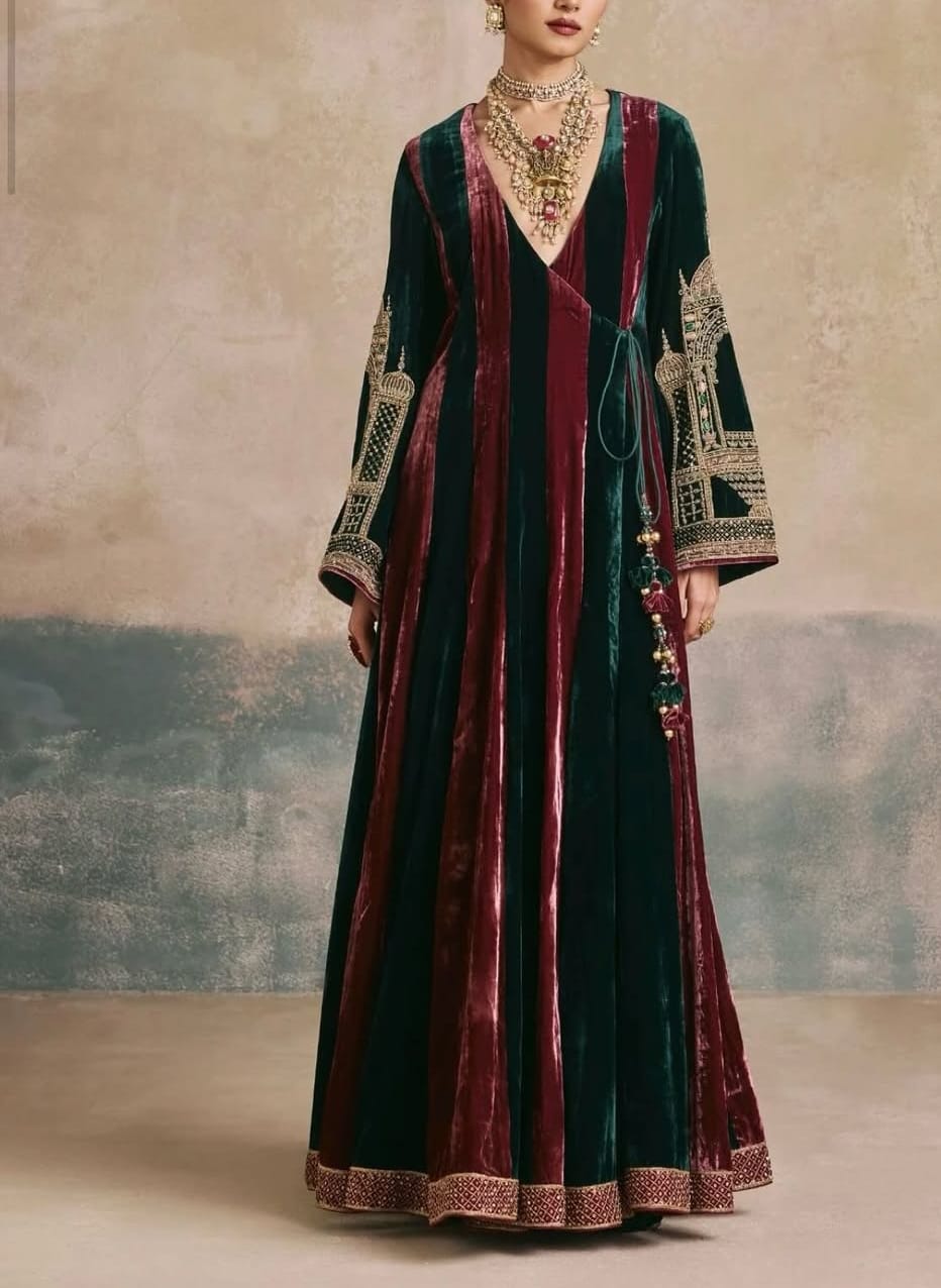 Handworked velvet Kalidaar with chiffon dupatta and korean raw silk pants