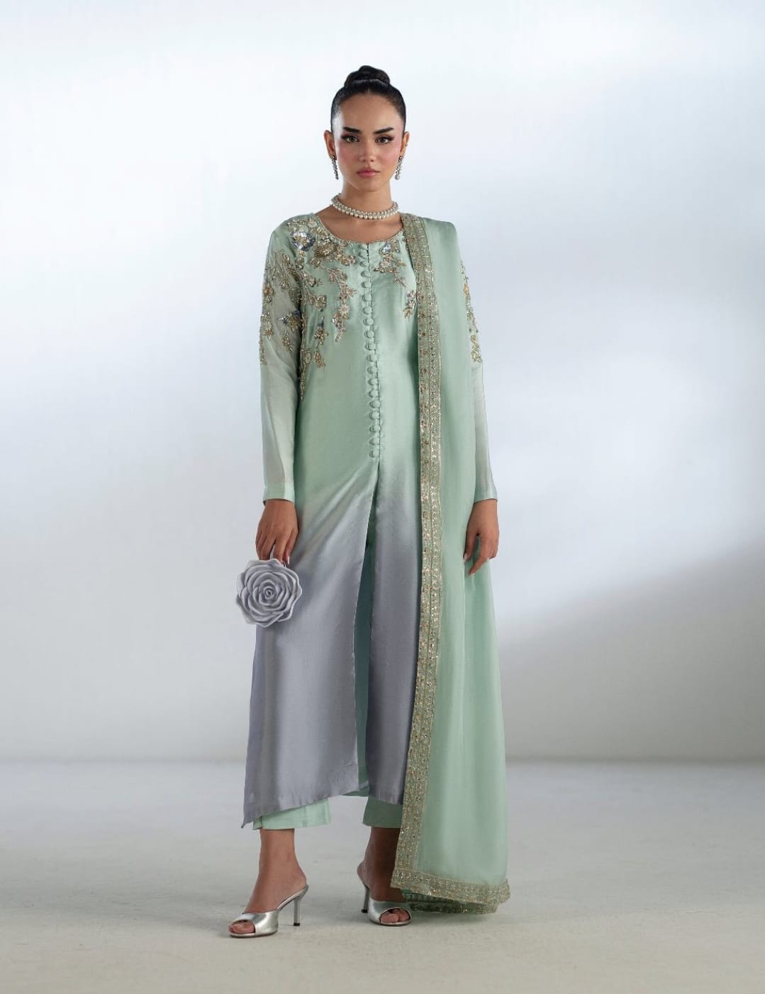 Handworked charmuse silk with organza embroidered dupatta and korean raw silk pants